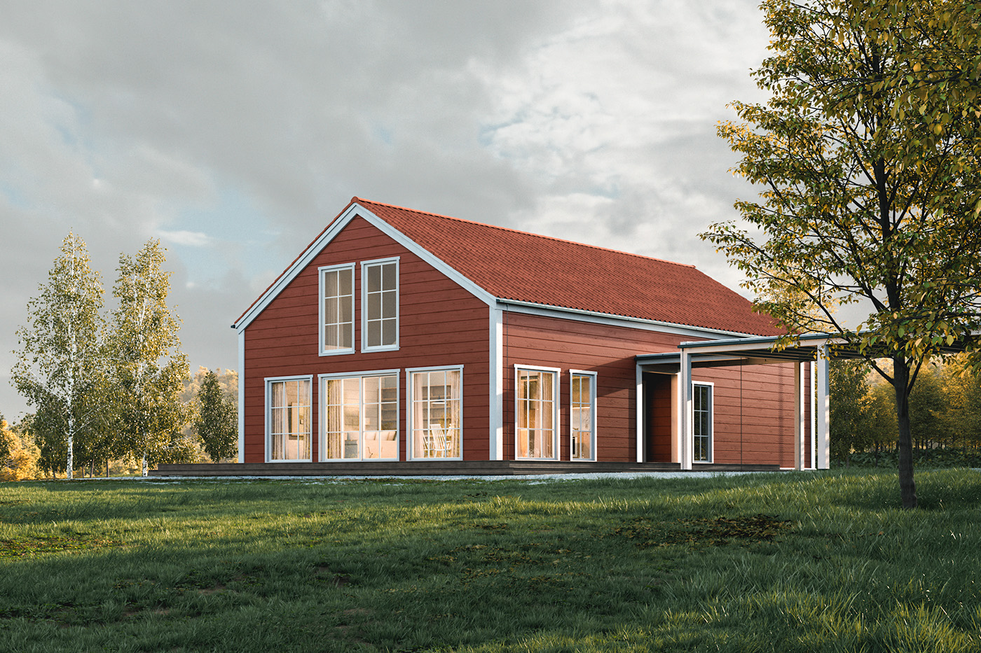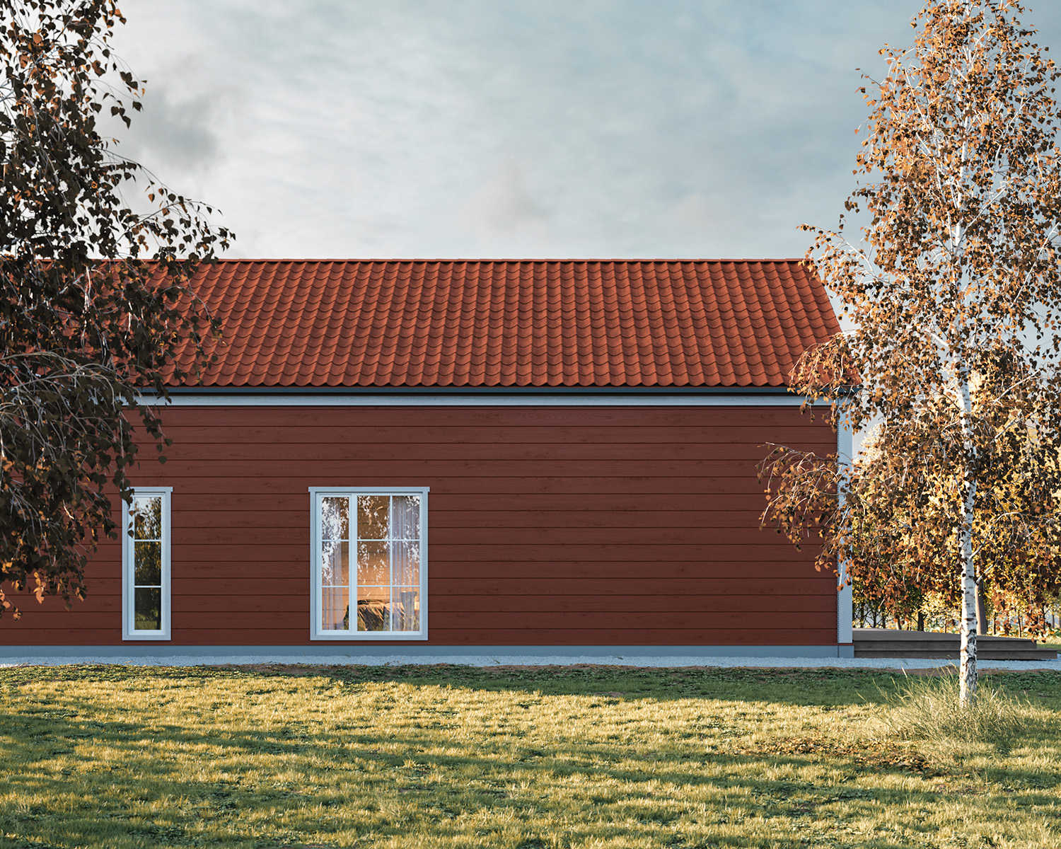 In this GROW 1 construction variation, a painted glulam log wall is complemented by a dovetail corner joint concealed behind a decorative contrasting finishing board, and the inclusion of windows with grids adds a touch of romance to the overall aesthetic.