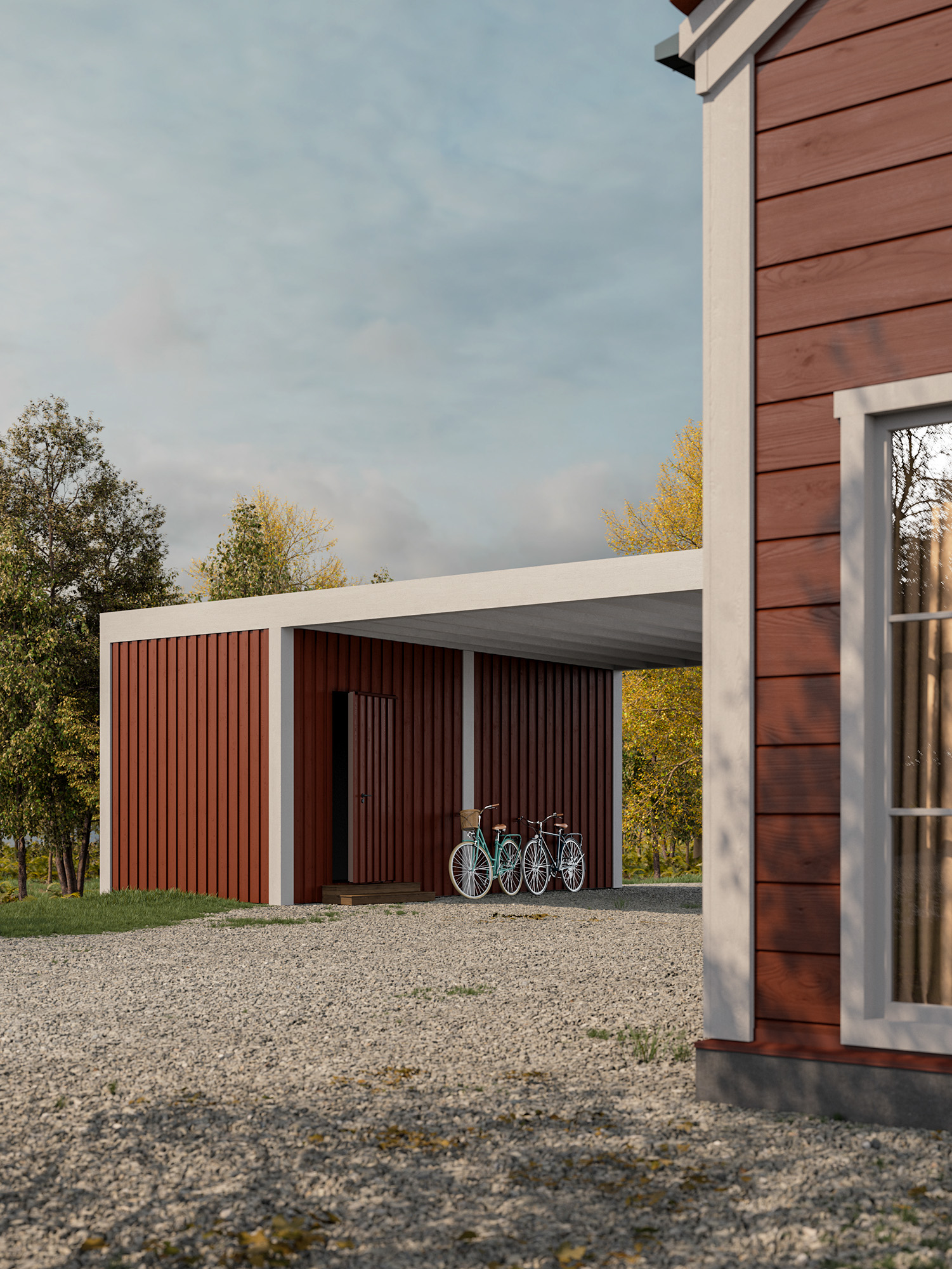 Harmonizing with the house exterior, the canopy accommodates two cars and provides storage for bicycles and garden equipment.
