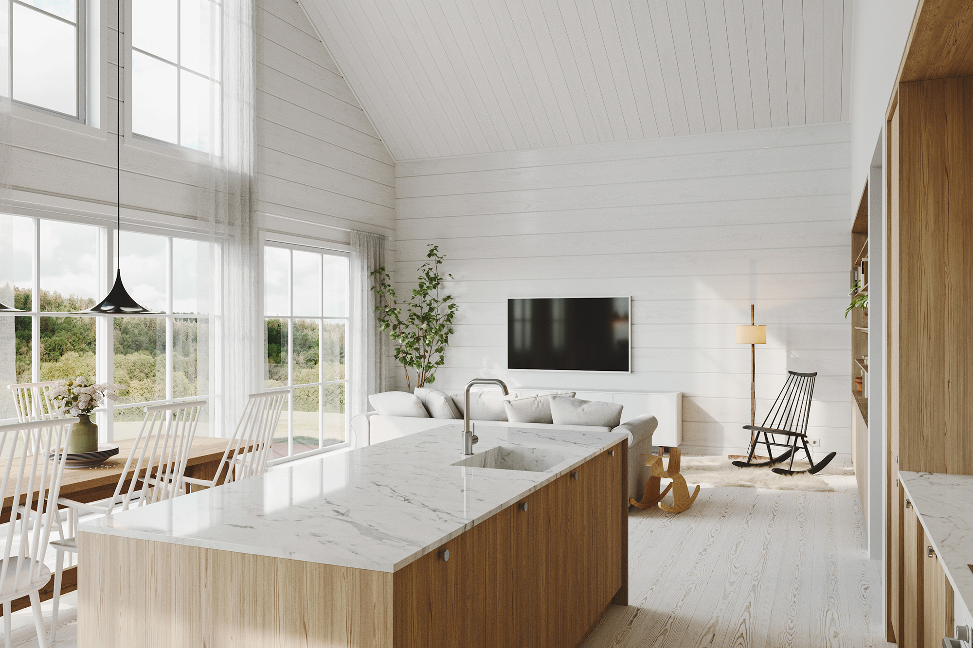 Constructed with glulam logs, the house exudes a romantic charm, while the white-painted interior walls give the large wooden surfaces a clean yet cozy appearance.