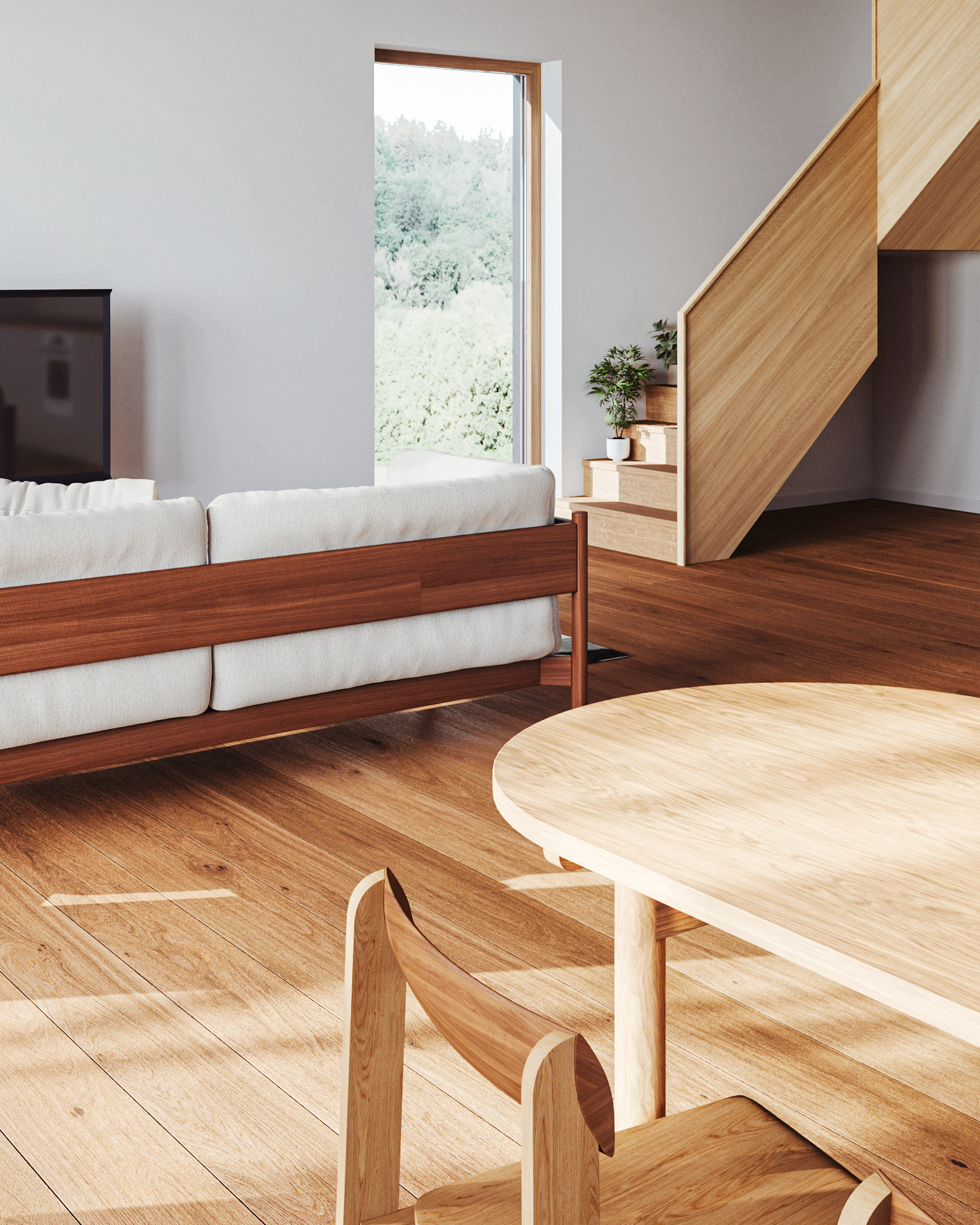 In this timber frame version, the wooden textures in the flooring, ceiling, and furniture adds a touch of warmth, creating a softer and cozier interior.