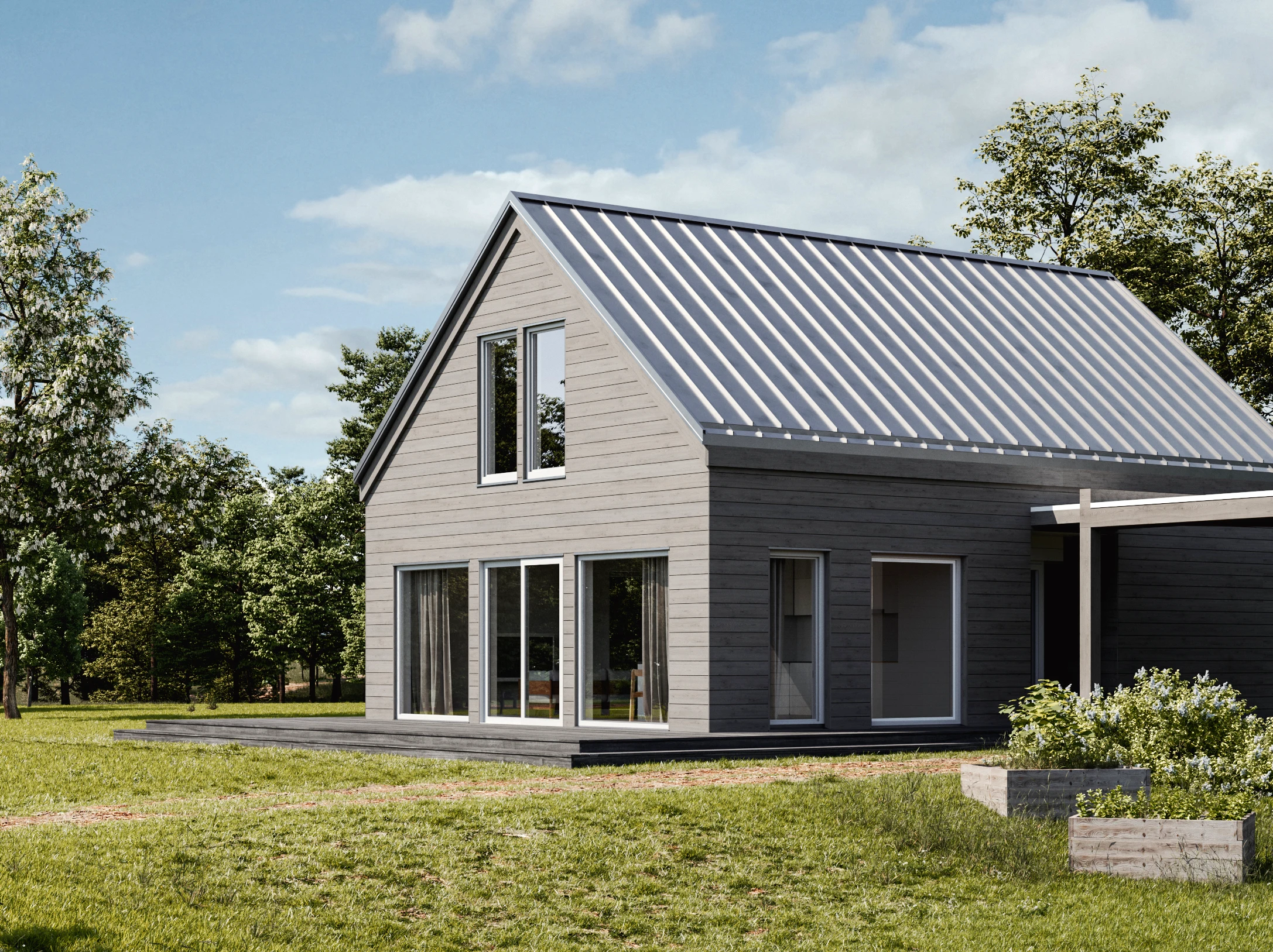 The two visual variations of the SETTLE 2 home showcase different cladding options for its timber frame construction. The exterior undergoes a notable transformation simply by opting for vertical cladding instead of horizontal, along with adjustments to the shade.